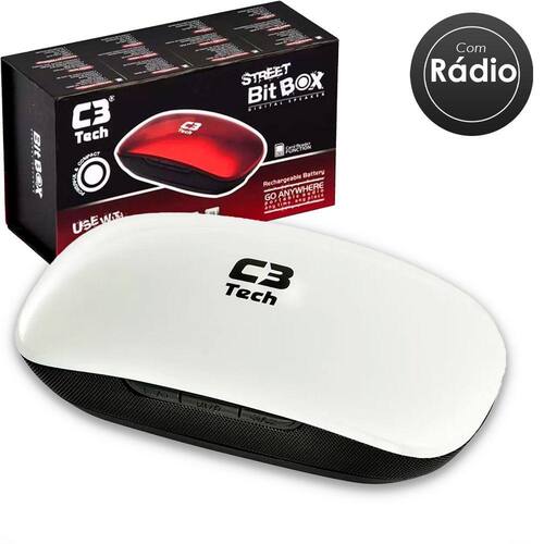 - Um produto que inova tanto no formato quanto nas características, a BitBOX C3 Tech inaugura uma geração de caixas de som ultra portáveis, com alta qualidade e desempenho. Seu formato arredondado relembra um mouse, com os controles dispostos em suas laterais. - Pode ser utilizado como caixa de som para notebooks, iPhones, iPads, ou outros aparelhos que possuam saídas de áudio do tipo P2. Através de um cabo USB e possível acessar o cartão SD para transferir musicas do computador como se fosse um pendrive. - Alem disso a BitBOX possui um sintonizador de FM com memoria, complementando o leque de funções do dispositivo. - Cor: Branco; - Compatível com PC´s, Notebooks, Aparelhos de MP3/MP4, iPhone, iPad entre outros que possuam conector P2; - Função Leitor de cartão SD/mSD com adaptador; - Controle de Volume/Avanço/Retrocesso/Sintonizador; - Potência de Saída: 1W RMS; - Sintonizador FM; - Número de Entradas: 1 tipo P2 (auxiliar); - Entrada para Fone de Ouvido: Sim (Estéreo); - Potência Total RMS: 1W RMS; - Distorção Máxima: 0,5% (1K, 1W); - Proteção Magnética: Sim; - Alimentação: Utilize conectado diretamente a porta de alimentação USB 5V DC.