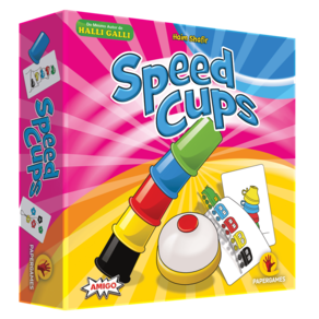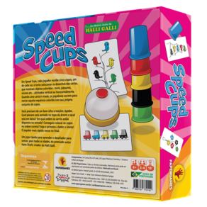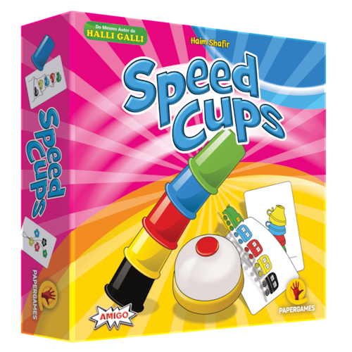 Em Speed Cups, cada jogador recebe cinco copos, um de cada cor, e tenta solucionar os desenhos das cartas, que mostram objetos coloridos ? trens, pássaros, xícaras etc. ? alinhados vertical ou horizontalmente. Quando uma carta é virada, os jogadores correm para recriar aquela sequência colorida com seu próprio conjunto de copos.