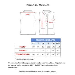 O SPENCER FEMININO é uma peça clássica para compor a vestimenta executiva.Tendência que nunca sai da moda, o SPENCER é a certeza de elegância.Possui dois bolsos embutidos na frente.Gola tradicional.Fechado frontal com botões. Tecido de Alta resistência Durabilidade Fácil lavagem e secagem Baixo amarrotamentoComposição: Tecido Oxford, 100% Poliéster.Produto Nacional vendido pela Loja de Confecções Ipê Roxo.Produto direto da fábrica e produzido com rigoroso controle de qualidade.Confira suas medidas na tabela.Para ajudar na sua escolha de tamanho: A Modelo Ana, veste tamanho PP, tem 1,63 de altura e pesa 51kg.Referência: 463AD1