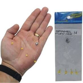 1 espinhel para tilápia e lambari O espinhel para lambari é muito eficiente na captura, podendo pegar mais de um peixe, pois conta com 4 anzóis com miçanga, que simulam a ração. Para uma maior efetividade do espinhel, em locais com grande concentração de lambaris, recomenda-se jogar uma quirera na água primeiramente e em seguida jogar o espinhel, que afundará com ajuda do Cinza que vem na ponta e ficará esticado na vertical na coluna d'água, capturando até 4 peixes de uma vez. Conteúdo da embalagem 1 spinhel chicote com 4 anzóis, 4 miçanga, 1 Cinza e linha monofilamento de 90cm comprimento. Cada pernada possui 4cm comprimento cada perna e o chicote possui 90cm comprimento da ponta ate ao final da outra ponta com Cinza Anzol pequeno para pequenos peixes medindo 9mm altura, 5mm de largura e a miçanga com 3mm de diâmetro Marca: Não Informado