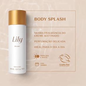 Para perfumar a pele com uma fragrância suave do seu item favorito, o body splash cabe no nécessaire--------------------- BIG BOOST ------------------------Splash Desodorante Colônia Lily 200MlSplash Desodorante Colônia Lily 200ml Está em busca de um produto para prolongar a perfumação da sua fragrância favorita e deixar o momento de autocuidado ainda mais especial? O Body Splash Desodorante Colônia Lily é ideal para você! Com o mesmo cheirinho do Creme Acetinado Hidratante Desodorante Corporal Lily, a fragrância feminina do splash corporal é o item certo para promover perfumação suave na sua rotina. O formato facilita a aplicação várias vezes ao longo do dia e é super fácil de levar sempre com você no nécessaire. Além disso, a fragrância Floral Bouquet do splash cria a combinação perfeita com o creme acetinado e o Lily Eau de Parfum ou Leau de Lily Desodorante Colônia. PARA TODOS VEREM O frasco do splash de Lily é cilíndrico, feito de metal e possui cor branca. Já a sua tampa é feita de plástico, é dourada e acompanha o formato do frasco. No centro está escrito Lily, enquanto na parte inferior contém as informações: 200ml 6.8 fl. Oz.76%. Nenhum produto do Boticário é testado em animais. Ingredientes atualizados na data desta publicação. Mas é importante lembrar de sempre verificar a embalagem, a informação mais atual é a do rótulo do produto. Como Usar Splash Desodorante Colônia Lily 200ml Conselho de Aplicação Borrife a fragrância nas áreas onde há maior circulação do sangue, como o pescoço, dobras do cotovelo e atrás das orelhas. Pirâmide Olfativa Topo: Mandarina, Pêra, Pêssego, Damasco, Pimenta-Rosa. Corpo: Osmanthus, Gardênia, Jasmim, Rosa, Violeta, Lírio, Íris, Narciso. Fundo: Sândalo, Musgo, Musk, Baunilha, Patchouly, Vetiver, Âmbar.