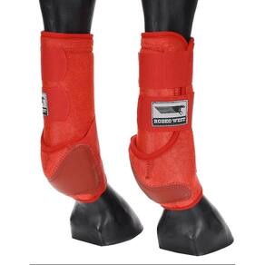 Par de Splint Boots Rodeo West, fabricados em neoprene com revestimento em nylon. Possui um sistema de fechamento em tira autocolante na parte frontal dando maior facilidade na hora de colocar ou retirar a proteção. Utilizados nas patas dianteiras do animal.