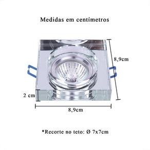 - Material: Cristal espelhado transparente e metal cromado - Dimensões: L 8,9 cm x C 8,9 cm A 2 cm - Recorte no teto :7x7 - Quantidade de lâmpadas: 01 - Bocal: GU10 - Modelo da lâmpada: MR16 - Potência máxima: 50W