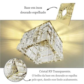 A base dourada espelhada do spot possui um acabamento impecável, complementando perfeitamente o brilho do cristal e adicionando um elemento de luxo ao design. Além disso, o material utilizado na fabricação é cristal transparente e inox, garantindo durabilidade e resistência.
