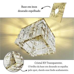 A base dourada espelhada do spot possui um acabamento impecável, complementando perfeitamente o brilho do cristal e adicionando um elemento de luxo ao design. Além disso, o material utilizado na fabricação é cristal transparente e inox, garantindo durabilidade e resistência.