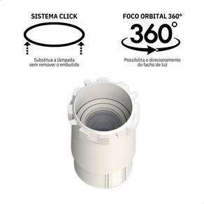 Características: - Sistema Click: Substitua a lâmpada sem remover o embutido. - Foco orbital 360º: Possibilita o direcionamento do facho de luz. - Acompanha soquete GU10 com rapicho. - NÃO acompanha lâmpada.