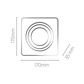 Especificações Gerais do Produto:Dimensões AxLxP (mm): 35x170x170Material: Termoplástico Proshield UVGarantia: 5 anos junto ao fabricanteGrau de Proteção: IP 20Lâmpada Inclusa: NãoLâmpada Indicada: PAR30Local de Uso: InternoNúmero de Lâmpadas: 1Soquete: E27Nicho para Instalação: 155x155x130*mm *a profundidade pode variar de acordo com a lâmpada utilizada.Formato: QuadradoVoltagem: BivoltFoco Orbital: 360Recuado: SimSistema Click: Substitui a lâmpada sem remover o embutidoObservação: Utilizar somente com lâmpada LEDCor: Branco