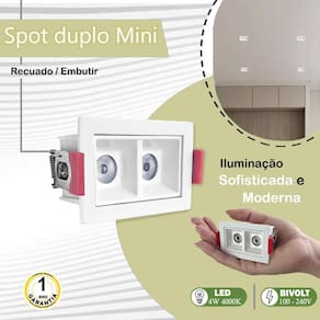 Um spot mini recuado duplo com LED integrado é uma excelente escolha para quem busca uma iluminação discreta, eficiente e elegante em ambientes internos. O spot é recuado, ou seja, fica embutido no teto, oferecendo um visual limpo e discreto. O formato duplo permite dois pontos de luz em um único módulo, otimizando o espaço, por ser recuado e possuir dois focos de luz, o spot garante uma iluminação bem distribuída, evitando sombras fortes ou áreas mal iluminadas.