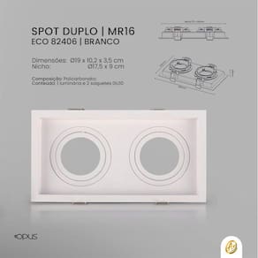 Com dimensões de 19x10,2x3,5cm e um nicho de 17,5x9cm, esse spot é projetado para acomodar duas lâmpadas MR16. Além disso, ele inclui dois soquetes GU10, garantindo uma instalação fácil e rápida.