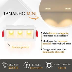 - Potência: 6W - Tensão: 100V ou 240V - Frequência: 50/60HZ - Grau de Proteção: IP20 - Ângulo de Abertura: 24 - Fluxo Luminoso: 480 lm - Facho: 3 - Temperatura de Cor: Branco quente 3000k