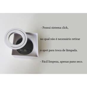 - Possuem foco Direcionável - Fácil Limpeza pano seco sem produtos abrasivos - Possui sistema click, no qual não é necessário retirar o spot para troca de lâmpada.