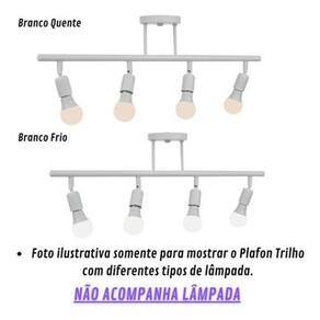 Luminária plafon 4 e27 trilho branco fosco --------------------------------------------------------------------------------------------------------------- Descrição do produto: Modelo: plafon trilho articulável 4 e27 Material: alumínio Cor do acabamento: branco fosco Tensão de rede: bivolt 127v / 220v Ambiente: interno/externo Garantia: 6 meses contra defeitos de fabricação