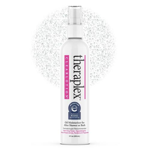 - Informações sobre o produto: Theraplex Clear Lotion é um óleo emoliente leve, rápido e penetrante, ideal para uso após o banho ou banho. Quando aplicada na pele úmida, a loção transparente sela a umidade, substituindo os óleos naturais que a água e o sabão podem retirar.