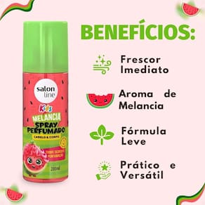Com uma fórmula cuidadosamente elaborada, o Spray Perfumado Salon Line Kids Melancia é dermatologicamente testado, garantindo cuidado e proteção para a pele sensível das crianças. Sua fragrância frutal doce de melancia transforma a rotina de cuidados em um momento de pura alegria e diversão.