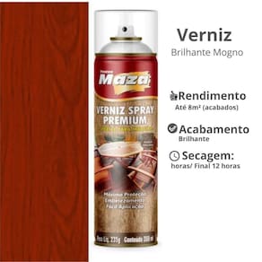 Spray Verniz Mogno Brilhante 400ml Maza ATENÇÃO: As cores dos produtos podem sofrer variações em função das características do monitor e do ambiente durante sua visualização. O Verniz Spray Cores Maza 235g é a escolha perfeita para quem busca um acabamento brilhante e de alta qualidade. Com a cor Mogno, este verniz adiciona um toque de sofisticação e elegância a qualquer projeto. Este produto é fácil de aplicar e tem um tempo de secagem de apenas 12 horas, permitindo que você complete seus projetos de forma rápida e eficiente. Além disso, com um rendimento de 8 m, este verniz spray é ideal para pequenos e grandes projetos. A linha Verniz Spray da Maza é conhecida por sua durabilidade e resistência, garantindo que seu trabalho tenha uma aparência e duradoura. Este verniz é vendido em unidades de 350 mL, tornando-o uma opção econômica para todos os seus projetos de acabamento. Em suma, o Verniz Spray Cores Maza 235g é uma opção versátil e de alta qualidade para todos os seus projetos de acabamento. Com sua cor Imbuia e acabamento brilhante, este verniz irá realçar a beleza natural de qualquer peça. OBSERVAÇÕES: Os objetos que ambientam as imagens não acompanham o produto. Produtos e cores podem variar daqueles representados na embalagem. Marca: Não Informado