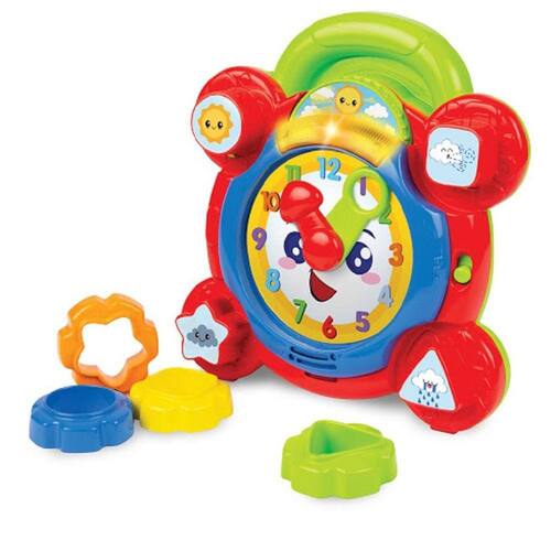 Relógio de aprendizagem ponteiros giratórios 4 blocos classificadores de forma com efeitos sonoros climáticos (Sol, Vento, Nublado e Chuva) Disco giratório mostra dia e noite Efeitos sonoros, melodias alegres e luzes intermitentes"