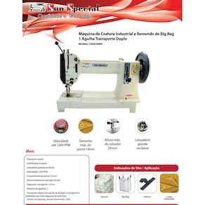 Máquina de costura industrial para fechamento, pregar alças e remendas de big bags, sacaria, rafia ou encerados. Possui alavanca para costuras livres (esquerda/direita, frente/atrás e circular). Utilizada para costuras pesadas em materiais com até 15mm de espessura, com transporte duplo (inferior por dentes e superior por 2 calcadores). Cabeçote alongado de 420 mm com vão livre entre agulha e coluna facilita o manuseio do produto. Motor servo de correia com controle de velocidade, 800W, Bivolt, com parada de agulha.Funções