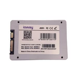 SSD 240GB Ioway de alto desempenho. Aumente muito a capacidade do seu sistema, alcançando velocidades de leitura e gravação de até 560 MB/s e 500 MB/s, respectivamente. Este produto conta com uma interface SATAIII, que é responsável pela transferência eficiente de dados com a placa-mãe do seu computador. Sua alta velocidade de envio de informação é de extrema importância, proporcionando um significativo aprimoramento no desemprenho do sistema.Especificações TécnicasCapacidade de armazenamento: 240GBVelocidade de leitura e gravação: 560MB/s X 500MB/sInterface: SATA3Formato físico: 2,5MTBF Mean Time Between Failures : 1000000HVida útil TBW - Total Bytes Written 160TBGarantia: 3 anosTamanho: 145x90x17mmPeso: 45g