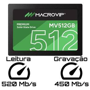 - Marca: Macrovip - Linha: Premium - Modelo: MV512GB - Capacidade: 512 GB - Formato: 2.5 Polegadas (7mm de espessura) - Interface: SATA III (6 Gb/s) - Retrocompatível com SATA II - Velocidade de Leitura Sequencial: Até 520 MB/s - Velocidade de Gravação Sequencial: Até 450 MB/s - Tecnologia: SSD (Solid State Drive) - Temperatura de Operação: 0 graus a 70 graus Celsius - Resistência: Resistente a choques e vibrações (sem peças mecânicas) - Aplicação: Desktops, Notebooks, All-in-One e outros dispositivos compatíveis com SATA Marca: Não Informado