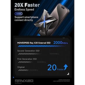 - ?Design super legal e moderno?O SSD externo de 2 TB da série MOVE SPEED Ray X20 tem um design mecânico simplificado em forma de "X", inspirado na plataforma de lançamento de uma espaçonave alienígena e incorpora o elemento "X" representando o símbolo misterioso nele. Após milhares de polimentos, torna-o o brilho e os contornos de uma nave espacial. Efeitos de iluminação RGB legais, luzes saltando e fluindo durante todo o processo de uso, dando a você uma extraordinária experiência de transmissão avançada.