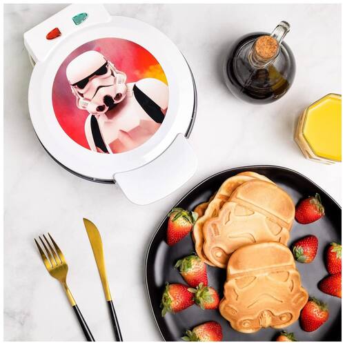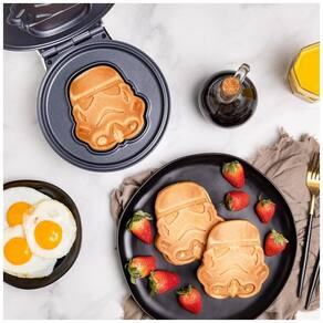 Máquina de Waffle Star Wars Stormtrooper, faz dois tamanhos diferentes de waffles (capacete Stormtrooper e redondo de 18cm), com revestimento antiaderente e controle de temperatura ajustável.Porta-fio