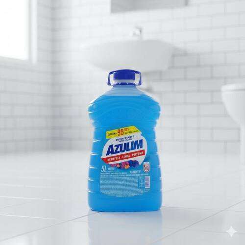 O desinfetante azulim pode ser encontrado nas versões: mariner, wave e erva-doce Possui satisfatória ação bactericida frente as cepas salmonella choleraesuis e staphylococcus aureus; Produto biodegradável.