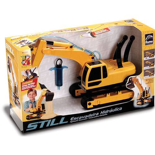 O primeiro brinquedo com mecanismo hidráulico que funciona de verdade. São 3 movimentos da pá e do braço articulado, cada um comandado por uma alavanca independente.