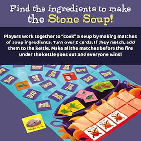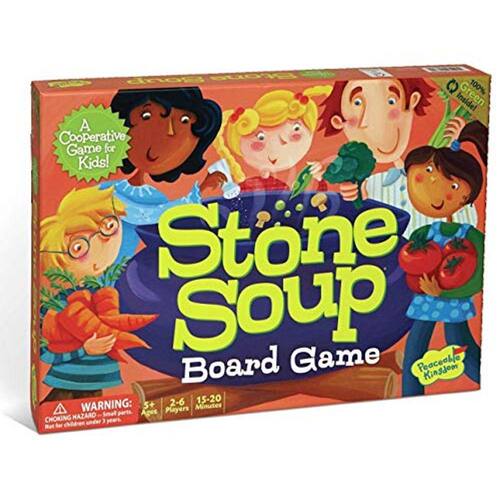 O tipo de produto é Peaceable Kingdom Stone Soup Cooperative Memory Board Game for Kids. O produto é feito na China. É fabricado pela Peaceable Kingdom. Jogue um jogo completo em 15 minutos. As crianças praticam habilidades de memória, desenvolvimento social, ajuda aos outros e cooperação.