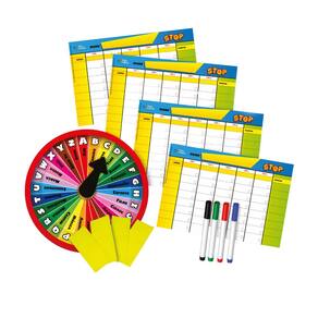 Gire a roleta para escolher a letra, escreva palavras únicas em cartelas reutilizáveis com canetas apagáveis (categorias como cor, animal, objeto); grite "STOP" ao completar primeiro, pontuando mais se respostas forem exclusivas, vencendo após várias rodadas.