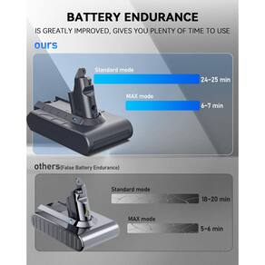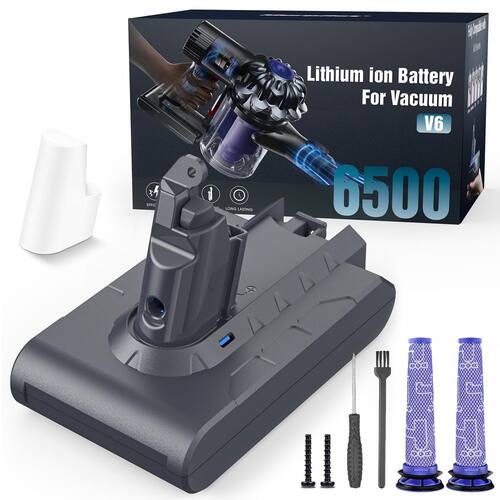 - MAIS POTÊNCIA, MAIS DURABILIDADE: A bateria de substituição ultralongada para V6 atende às necessidades de limpeza profunda de sua sala grande. A bateria de 6500mAh para a série V6 está equipada com um chip de bateria premium atualizado, portanto, tem maior duração e carregamento mais rápido