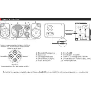 Características:Alimentação: USB - DC5V (1 A)Potência total: 11W RMSPotência subwoofer: 3” (5W)Potência cx satélites: 2,75” x 2 (3W x 2)Frequência de resposta: 40Hz~18kHz