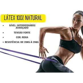 Nível: Intermediário - Avançado Resistência: de 28kg à 39kg - Média 35kg Beneficios: Fortalecimento e Definição Muscular Dimensões: 3,2 cm largura x 0,5 espessura x 208 comprimento dobrado Cor: Roxa Material : Látex Natural