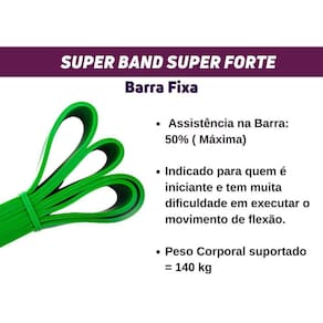 Super Band Bravus Sport Super Forte Elástico Barra Fixa Kit Super Band Bravus Sport Super ForteSuper Band Super Forte VerdePerfeita para iniciantes que desejam uma progressão rápida na barra fixa, a Super Band Bravus Super Forte é o verdadeiro titã da linhaPara flexões e flexões assistidas, basta passar a faixa por cima de uma barra fixa e você terá um apoio para se exercitar e evoluir na execução do exercício.A super band também funciona muito bem para treinamentos de velocidade e agilidade, força, treinamento funcional, cruzado, Artes Marciais Mistas (MMA) e muito mais.Assista uma de nossas vídeo aulas e aprenda como usar sua Super Band e leve o seu treino para o próximo nível. Barra Fixa:Para quem precisa de maior assistência para executar os exercícios na barra, pull up ou muscle up e progredir com mais rapidez, tenha a sua disposição e atinja os resultados que você sempre buscou Tenha assistência de 40 à 50% na elevação da barra fixa com a Super Band Super Forte.Na barra fixa, comece com a super band Verde e vá evoluindo para Roxa para ter assistência mediana.As super bands mais finas, como a Preta e vermelha são mais leves e permitem uma assitência leve.Isso lhe ajudará a conseguir uma evolução rápida e completa.A Super Band apresenta um design de alta qualidade e é feita com borracha espessa e durável. A Super Band Super Forte Verde tem as seguintes especificações:Super Band Elástico Extensor Borracha - Nível Super Forte Nível: Avançado Resistência: 45Kg Beneficios: Fortalecimento e Definição Muscular Dimensões: 4,5 cm largura x 0,5 espessura x 208 comprimento dobrado Cor: Verde Material : Látex de Alta Resistência Beneficios e Uso:Progressão na Barra Fixa Assistida: Você pode usar as super bands para ajudar sua progressão na barra fixa e evoluir com mais rapidez.As super bands compensam o peso do seu corpo para que você obtenha mais repetições e aumente a força mais rapidamente.Alongamento e Fortalecimento: As super bands são adequadas para treinar seus braços, costas, ombros, pernas e bumbum de uma só vez.Eexercício e Reabilitação: Perfeito para treinamento funcional, yoga e fisioterapia, as super bands são excelentes para ajudar a fortalecer os ligamentos e músculos.As Super Bands de resistência pesada são usadas até mesmo para a maioria das Reabilitações musculares.Qualidade - Por serem feitas com Látex 100% Natural, as super bands da Bravus são duráveis e podem ser esticadas repetidamente ano após ano. Adequado para qualquer nível de praticante - Cada Super Band oferece um nível diferente de resistência, tanto para o treinamento de barra fixa, como para adicionar resistências ao supino, flexões, agachamento e levantamentos.