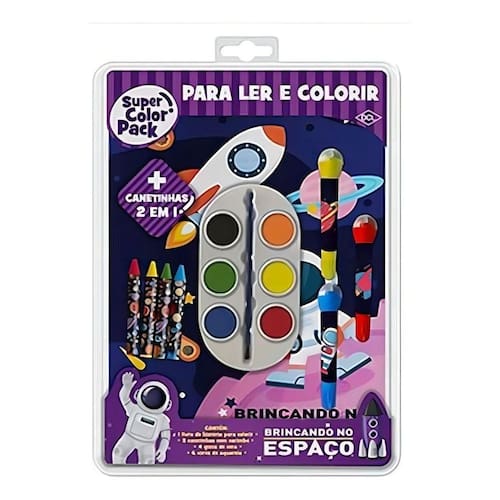 Livro cheio de diversão para brincar no espaço sideral. Este blister inclui livro para ler e colorir, gizes de cera, paleta de aquarela e canetinhas com carimbos acoplados.