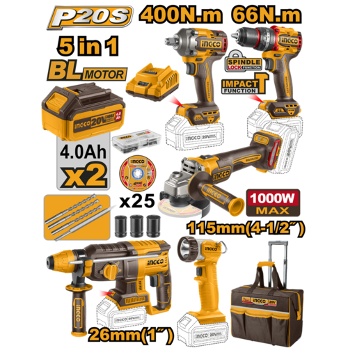 PARAFUSADEIRA / FURADEIRA INGCO COM IMPACTO 1/2” BL 66NM À BATERIA 20V CHAVE DE IMPACTO ENCAIXE QUADRADO 1/2” INGCO 400NM À BATERIA 20V MARTELETE ROTATIVO INGCO 2,5J SDS-PLUS À BATERIA ÍON-LÍTIO 20V ESMERILHADEIRA ANGULAR BL INGCO 4.1/2” 1.000W MAX 3 VEL À BATERIA 20V LANTERNA DE TRABALHO INGCO 270 LUMENS À BATERIA 20V BOLSA PARA FERRAMENTAS INGCO COM 2 BATERIAS 20V 4.0AH