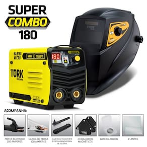 Marca: Super Tork Modelo: Cim-6180-220V Funções: Solda MMA e Tig-Lift (para chapas finas e acabamentos precisos) Potência: 7.800W, voltagem 220V Amperagem: 20A a 180A Diâmetro do Eletrodo: 2,0 a 4,0mm Funções automáticas: Hot Start, Arc Force, Anti Stick Display digital e indicador de proteção térmica Tecnologia IGBT para baixo consumo de energia
