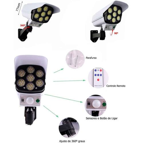 Super kit 2 câmeras fake solar piscante espanta ladrão a prova dágua externo 7 cobs 42 super leds Super luminária solar sensor presença parede funções câmera 7 cobs 42 leds Proteja sua propriedade com a inovadora câmera placa solar detector de movimento externo. Esta luminária solar é mais do que apenas uma luz externa, é uma solução de segurança completa. Equipada com sensor de proximidade e tecnologia de detecção de movimento, esta câmera é alimentada por energia solar, proporcionando-lhe tranquilidade durante todo o dia. Com 42 leds e 7 cobs, esta luminária oferece uma iluminação brilhante e eficiente, enquanto seu design resistente às intempéries garante durabilidade em qualquer condição. A bateria de íon-lítio de 2800mah é recarregada em apenas 6-8 horas de exposição ao sol, mantendo-a pronta para a ação. Com três modos de sensor de movimento e um controle remoto conveniente, você tem o controle total sobre a segurança da sua casa ou estabelecimento. Não deixe sua segurança ao acaso, invista na câmera placa solar detector de movimento externo e proteja o que é importante para você. Essa câmera não grava ou filma, é uma camera fake luminaria solar fake Características: Fonte de energia: solar Quantidade de led: 42 Quantidade de cobs: 7 Detector de movimento: 2 a 3 metros de distância Recarga: 6-8 horas de exposição ao sol Bateria de íon-lítio: 3,7v 2800mah Resistência à água: ip65 Material: abs e componentes eletrônicos Sensor inteligente que desliga durante o dia Fácil de instalar 3 modos de sensor de movimento Distância de detecção de até 3m de altura Controle remoto incluso 4. Modo de usar: Instale a luminária em uma área externa com exposição adequada à luz solar. Certifique-se de que o sensor de movimento esteja livre de obstruções. Utilize o controle remoto para ajustar os modos de sensor conforme necessário. Ficha técnica: Leds: 42 Cobs: 7 Sensor de movimento: 2-3 metros Bateria: íon-lítio 3,7v 2800mah Resistência à água: ip65 Especificações: Material: abs e componentes eletrônicos Cores disponíveis: preta ou branca Modos de sensor: luz fraca, indução de luz forte, indução de luz baixa Distância de detecção: até 3m de altura Controle: remoto incluso Itens inclusos: 1 câmera placa solar detector de movimento externo 1 base de sustentação 1 controle remoto 1 kit parafusos