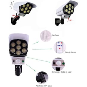 Super luminaria formato camera led potente moderna + segurança 7 cobs 42 super leds Super luminária solar sensor presença parede funções câmera 7 cobs 42 leds Proteja sua propriedade com a inovadora câmera placa solar detector de movimento externo. Esta luminária solar é mais do que apenas uma luz externa, é uma solução de segurança completa. Equipada com sensor de proximidade e tecnologia de detecção de movimento, esta câmera é alimentada por energia solar, proporcionando-lhe tranquilidade durante todo o dia. Com 42 leds e 7 cobs, esta luminária oferece uma iluminação brilhante e eficiente, enquanto seu design resistente às intempéries garante durabilidade em qualquer condição. A bateria de íon-lítio de 2800mah é recarregada em apenas 6-8 horas de exposição ao sol, mantendo-a pronta para a ação. Com três modos de sensor de movimento e um controle remoto conveniente, você tem o controle total sobre a segurança da sua casa ou estabelecimento. Não deixe sua segurança ao acaso, invista na câmera placa solar detector de movimento externo e proteja o que é importante para você. Essa câmera não grava ou filma, é uma camera fake luminaria solar fake Características: Fonte de energia: solar Quantidade de led: 42 Quantidade de cobs: 7 Detector de movimento: 2 a 3 metros de distância Recarga: 6-8 horas de exposição ao sol Bateria de íon-lítio: 3,7v 2800mah Resistência à água: ip65 Material: abs e componentes eletrônicos Sensor inteligente que desliga durante o dia Fácil de instalar 3 modos de sensor de movimento Distância de detecção de até 3m de altura Controle remoto incluso 4. Modo de usar: Instale a luminária em uma área externa com exposição adequada à luz solar. Certifique-se de que o sensor de movimento esteja livre de obstruções. Utilize o controle remoto para ajustar os modos de sensor conforme necessário. Ficha técnica: Leds: 42 Cobs: 7 Sensor de movimento: 2-3 metros Bateria: íon-lítio 3,7v 2800mah Resistência à água: ip65 Especificações: Material: abs e componentes eletrônicos Cores disponíveis: preta ou branca Modos de sensor: luz fraca, indução de luz forte, indução de luz baixa Distância de detecção: até 3m de altura Controle: remoto incluso Itens inclusos: 1 câmera placa solar detector de movimento externo 1 base de sustentação 1 controle remoto 1 kit parafusos