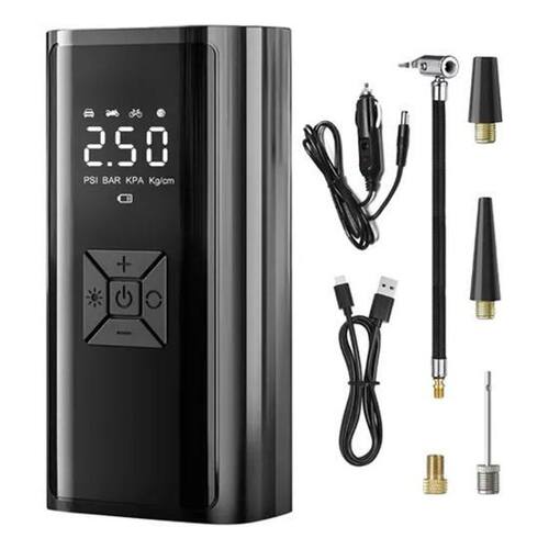 Super Mini Compressor Digital Bomba De Encher Pneus Bola Portátil Para Motocicletas Carro Bicicleta Preto Com Calibrador Super Compressor Calibrador Bomba de Encher Pneu Portátil sem fio - Liberdade e Conveniência em Suas Mãos Diferenciais - Alta Potência, maior durabilidade de bateria, lanterna, luz de advertência, luz de sinalização. Com o Compressor Portátil, você está no controle total da pressão dos seus pneus e infláveis onde quer que vá. Com sua bateria interna de 4500mAh recarregável, este compressor oferece potência sem a necessidade de cabos incômodos ou conexões complicadas. Desfrute de mobilidade absoluta, seja em emergências na estrada, no trajeto diário ou em aventuras ao ar livre. Sua impressionante tecnologia sem fio permite inflar pneus, bolas, colchões de ar e muito mais, sem a necessidade de conexão ao acendedor de ou tomada. Compacto e leve, o tamanho equivalente a um smartphone de tela de 4,7 polegadas, com apenas 490 gramas, este compressor é perfeito para caber no porta-luvas, na moto ou na sua mochila, tornando-se um fiel companheiro em qualquer situação. Você terá total visibilidade e controle da pressão com o visor digital integrado, garantindo precisão e facilidade de uso. Além disso, a pequena lanterna integrada oferece iluminação em ambientes de baixa luz, proporcionando ainda mais praticidade. Recarregar é uma tarefa rápida e eficiente, graças à interface de carregamento via cabo USB Tipo-C, incluso no kit. O Compressor Portátil acompanha uma variedade de bicos, incluindo um bico para pneu com rosca segura, bico para bola e até mesmo bicos para infláveis. Você estará sempre preparado para qualquer situação. Especificações: Material: ABS resistente e durável. Potência: 120W para inflação rápida. Fluxo de ar: 25L/min para resultados rápidos. Pressão de inflação: 0-150PSI Unidade: PSI/BAR/KPA/KG-CM2 Interface de carregamento via cabo USB Tipo-C. Cabo para carregamento não acompanha a fonte Cabo auxiliar para alimentação veicular