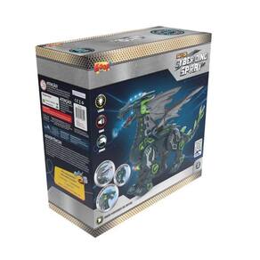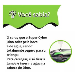 O Super Cyber Dino é um dinossauro irado! Com um design todo tecnológico, ele possui várias funções divertidas para incrementar mais a brincadeira. Ele possui luz na cabeça e no peito, reproduz sons simulando rugidos enquanto anda sozinho, mexe a cabeça e as asas e solta fumaça pela boca.