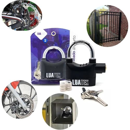 Supertrava cadeado com alarme sonoro 110db aço reforçado lk-bl16 preto 3 chaves Cadeado alarme sensor sonoro antifurto para ajudar a prevenir de roubos. Perfeito para uso em portões, garagens, galpões, motos, bicicletas, portas e portões, armários, e entre outros, com alarme de 110db que dispara ao menor movimento ou impacto. Cadeado com alarme sensor sonoro, manilha em aço fundido de 10 mm e corpo em liga de alumínio para duplicar a sua segurança. Multifunção: pode ser com ou sem função de alarme. É só retirar a manilha, virar e colocar novamente no corpo. Informações técnicas: Material: manilha de aço com 10mm Volume som: 110db pode ser com ou sem alarme Resistente a água e ao tempo Corpo em liga de alumínio: não enferruja Inclui 3 chaves de corte a laser: não pode ser copiada Inclui baterias lr44: 2 kit com 6 cada Tamanho total do cadeado: 13cm x 9.5cm x 3cm x 1cm Tamanho da fechadura: 8.5cm x 6.5cm x 3cm x 1cm Como funciona: 1 toque curto para armar 3 toques curtos para informar que irá disparar o alarme se não parar de mexer ou forçar o cadeado vai disparar a sirene de 110 decibéis. O alarme desarma sozinho, caso não mexam mais com o cadeado. Se o intruso continuar mexendo no cadeado ele continua disparando. Alarme de 2 tons bi p de aviso e sirene de 110 db. Não depende de instalação pois funciona com baterias - acompanha 6 baterias reserva e 6 baterias já instaladas no produto baterias de longa duração. Lembrando o cadeado vai desarmado, para ativar basta retirar a alça do cadeado e inverter a posição da haste Características destacadas: 1. Prova d'água e durável: Construído com materiais de alta qualidade, este cadeado é à prova d'água, garantindo a durabilidade e resistência necessárias para enfrentar as condições adversas do ambiente externo. Proteja seus bens valiosos sem se preocupar com as mudanças climáticas. 2. Alarme sonoro anti-furto: O destaque deste cadeado é o alarme sonoro embutido que dispara em caso de movimentos suspeitos ou tentativas de violação. O som alto e penetrante serve como um forte dissuasor contra ladrões, alertando imediatamente sobre qualquer tentativa de furto. 3. Trava de alta segurança: Equipado com uma trava de alta segurança, este cadeado oferece uma barreira resistente contra tentativas de arrombamento. Sua construção robusta proporciona tranquilidade, sabendo que seus pertences estão protegidos de forma eficaz. 4. Versatilidade de uso: Ideal para motos, bikes, motocicletas e até mesmo para uso em comércios, este cadeado oferece versatilidade em sua aplicação. Proteja seus ativos de maneira eficiente, independentemente do contexto de uso. 5. Fácil de usar e transportar: Com um design prático, o cadeado é fácil de usar e transportar. Sua portabilidade torna-o uma escolha conveniente para quem está sempre em movimento, garantindo segurança onde quer que você vá. 6. Segurança reforçada para a paz de espírito: Além de ser um impedimento físico, o alarme sonoro adiciona uma camada adicional de segurança, proporcionando tranquilidade quando você precisa deixar seus pertences sem vigilância. Informações técnicas: - marca: luatek - modelo: lk-bl16 - volume som: 110db - pode ser com ou sem alarme - resistente a água e ao tempo - detecta choque pancada e movimento - manilha de aço com 10mm - corpo em liga de alumínio não enferruja - inclui baterias lr44: 2 kit com 3 cada - inclui 3 chaves de corte a laser não pode ser copiada - tamanho total do produto: 10cm x 9.5cm x 3cm x 1cm - tamanho da fechadura: 6.5cm x 5.5cm x 1cm - peso: 273 gramas Conteúdo: 01 - cadeado alarme lk-bl16 03 - chaves 06 - baterias lr44
