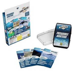 Super Trunfo Predadores Aquáticos traz 32 cartas com ilustrações e informações sobre os predadores dos mares. Em qual item o predador da sua carta é o melhor Será no peso Na agressividade Ou você tem o Super Trunfo Escolha, compare e vença esta emocionante disputa Homologação Inmetro: CE-BRI/IQB 006429 54879/21-004 Ean: 7908010143614