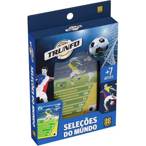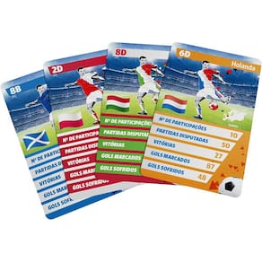Super Trunfo Seleções do Mundo traz 32 cartas com imagens e informações de seleções do mundo para uma disputa superdivertida! Você compara sua carta com a do outro jogador. Mas escolha bem a característica que vai utilizar a cada rodada, pois, se sua carta ganhar, você fica com a carta do outro jogador; se perder, ele fica com a sua! No final, vence quem ganha todas as cartas do jogo.