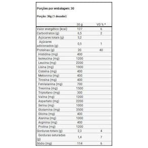 Benefícios: 22g de proteínas; 5,6 g de BCAAs; 2,6 g de Leucina; 3,6g de Carboidratos; 2,7g de Gorduras Totais; Ótima absorção pelo corpo; Pode beneficiar a imunidade;