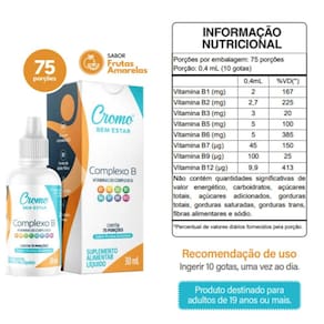 Composição: Vitaminas B1 (2 mg), B2 (2,7 mg), B3 (3 mg), B5 (5 mg), B6 (5 mg), B7 (45 g), B9 (100 g) e B12 (9,9 g) por porção de 0,4 mL (10 gotas)