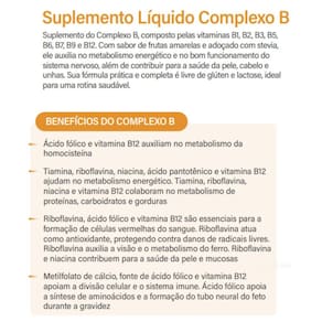 O Complexo B é um suplemento líquido composto por vitaminas essenciais do complexo B: B1, B2, B3, B5, B6, B7, B9 e B12. Com sabor de frutas amarelas e adoçado com stevia, ele auxilia no metabolismo energético, no bom funcionamento do sistema nervoso e contribui para a saúde da pele, cabelos e unhas. Sua fórmula prática e completa é livre de glúten e lactose, sendo ideal para quem busca mais disposição e bem-estar no dia a dia.