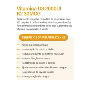 O suplemento de Vitamina D3 2000UI + K2 30mcg foi desenvolvido para auxiliar na absorção e fixação do cálcio no organismo, promovendo a saúde dos ossos e dentes. Sua fórmula líquida de fácil administração combina a Vitamina D3, essencial para o sistema imunológico e muscular, com a Vitamina K2, que contribui para a manutenção da saúde cardiovascular e óssea. Ideal para quem busca reforçar a imunidade e manter a saúde óssea em dia.