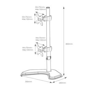 Suporte 2 Monitores 14 a 32 Vertical Base de Mesa SIM-800 - Modelo: SIM-800 Suporte vertical para 2 monitores de 14 a 32 polegadas com base de mesa AQUÁRIO SIM-800 Altura da coluna de 80 cm Medida da mesa até o topo da coluna central . O ajuste de altura do monitor pode ser feito desde a posição rente a mesa até o topo da coluna. Produzido em aço carbono com pintura epóxi eletrostática e tratamento Anti-Corrosão. OBSERVAÇÃO Pode atender monitores até 34 polegadas desde que tenham peso até 10 kg e VESA 75x75 ou 100x100mm. Para saber o VESA de seu monitor basta verificar se ele tem na parte traseira 4 pontos com rosca na medida de 7,5x75 ou 10x10cm. CARACTERÍSTICAS :: Sua base garante segurança na instalação e uso diário. :: A base do monitor pode ser rotacionada em 360º, permitindo visualização em orientação retrato ou paisagem. :: Pode também ser inclinada e girada para os lados. :: Organizador de cabos junto à coluna central. DIFERENCIAIS :: Atende a NR 17 Ergonomia . :: Não é necessário furar a mesa Montagem por simples apoio . :: Permite ajuste de altura, inclinação e rotação. :: Fácil instalação e organização dos cabos. :: Permite uso modo Retrato ou Paisagem. INFORMAÇÕES ADICIONAIS :: Polegadas: 14 a 32 polegadas. :: Inclinação: Até +45 / -45 limitado ao tamanho da tela :: Rotação lateral: 90. :: Rotação dos monitores: 360. :: Cor: Preto. :: Local de instalação: Mesa. :: Furação VESA: 75x75 e 100x100mm. :: Capacidade de carga: 10 kg. :: Material: Aço carbono. Características Gerais do Produto: Padrão VESA mm : 75x75; 100x100 Com Pistão a gás: Não Tamanho da Tela: De 14 a 32 Modo de Fixação: Apoio Peso Suportado: Limite de 10kg cada tela Local de Instalação: Mesa Cor do Suporte: Preto Acompanha o produto: Suporte para monitor SIM-800 Kit de parafusos para montagem do suporte Kit para fixação por parafuso Manual de instruções Certificado de : 1 ano junto ao fabricante