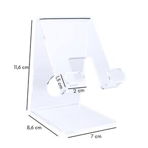 Características principais: - para tablets e celulares; - o uso do celular pode ser na vertical ou horizontal; - possui abertura para carregador; - seu design transparente permite visibilidade completa; - compacto para armazenar e transportar; - feito de acrílico resistente.