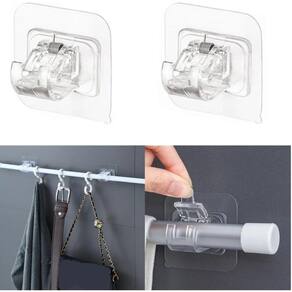 Embalagem com 4 unidades 1 par . Poderoso adesivo de alta qualidade, suporta até 2kg cada gancho. Utilizar varão com diâmetro máximo de 2,0cm. Indicado para paredes lisas e azulejos. Não utilizar em paredes com pinturas antigas, rachadas, mofadas ou com textura. Cada par tem a capacidade de 4 kg. Para cortinas maiores usar 3 peças ou mais. Material: abs Tamanho: c4,2 x l4,4 x a3,4cm. Faixa de grampo: 1.5cm - 2cm Cor: transparente